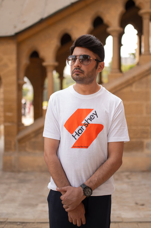 Crisp Cotton Tee in White with Bold Harshey Logo